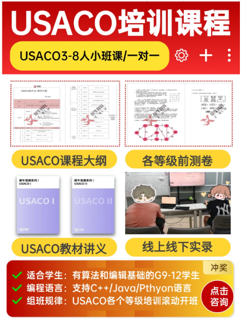 USACO培训课程线上线下灵活辅导,上海USACO培训、北京USACO培训均可,有专属前测定位学生基础,规划适合备考方案。