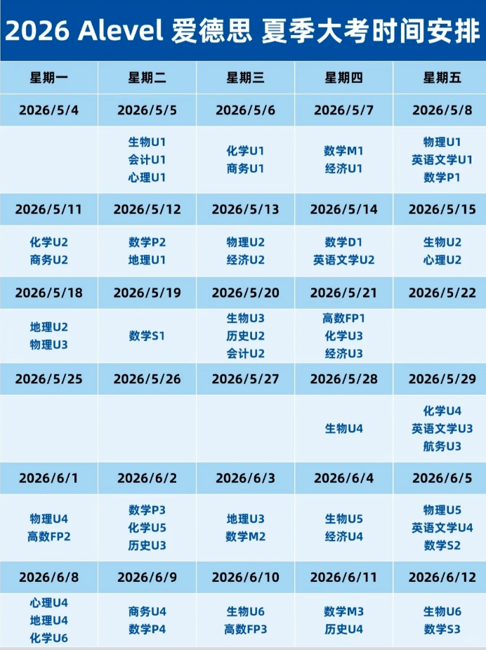 摘要:2026年Alevel夏季大考倒计时!爱德思/AQA/CIE三大考试局考试时间汇总!考前必看! 2026 年 A-Level 夏季大考倒计时已经正式开始了!三大考试局相继公布了今年的具体考试安排。今天,就为