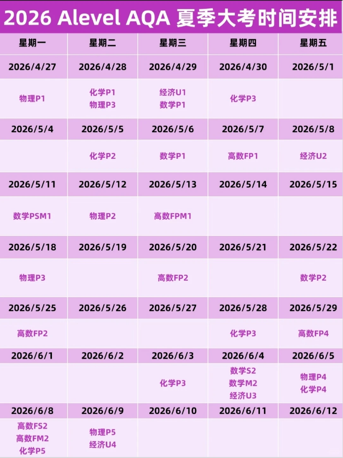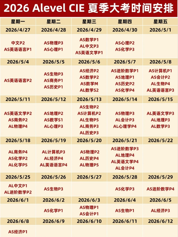 2026 年 A-Level 夏季大考倒计时已经正式开始了!三大考试局相继公布了今年的具体考试安排。今天,就为大家整理了三大考试局各个科目的具体考试时间!